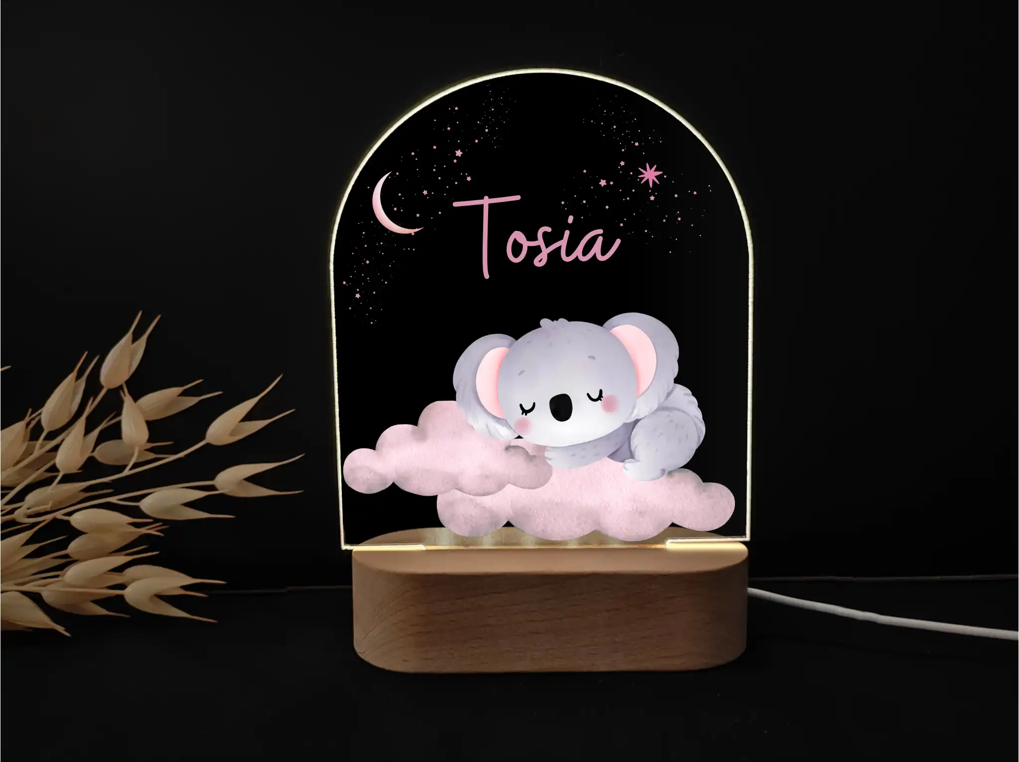 Personalizowana lampka nocna LED „Koala na chmurce” – różowa – Urocza dekoracja pokoju dziecka