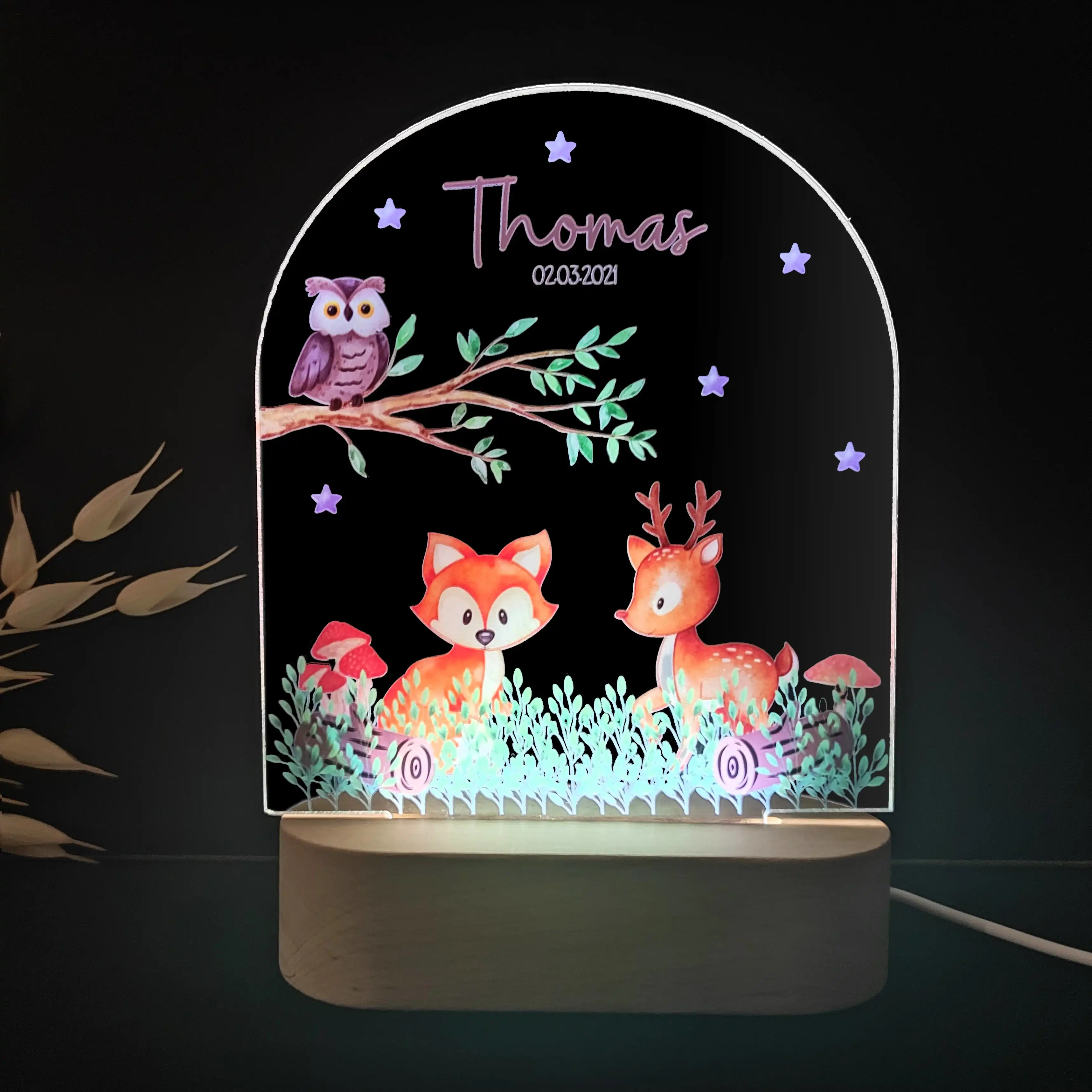 Lampka LED „Na polance” to urocza dekoracja przedstawiająca leśne zwierzątka na polanie, która wprowadzi przytulny nastrój do pokoju dziecka. Dzięki możliwości personalizacji imieniem dziecka oraz dodania daty lub dedykacji, staje się nie tylko praktycznym źródłem światła, ale także unikatową ozdobą i niezapomnianym prezentem.