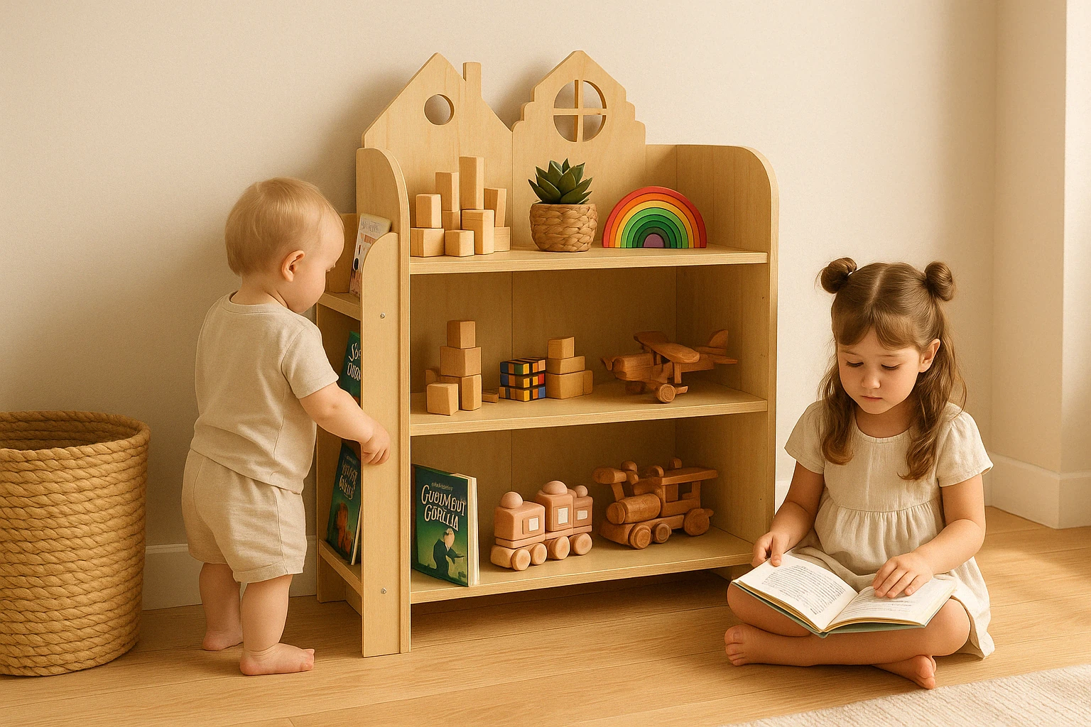 Drewniana Szafka Montessori z Półkami i Boczną Biblioteczką – Idealna do Pokoju Dziecięcego