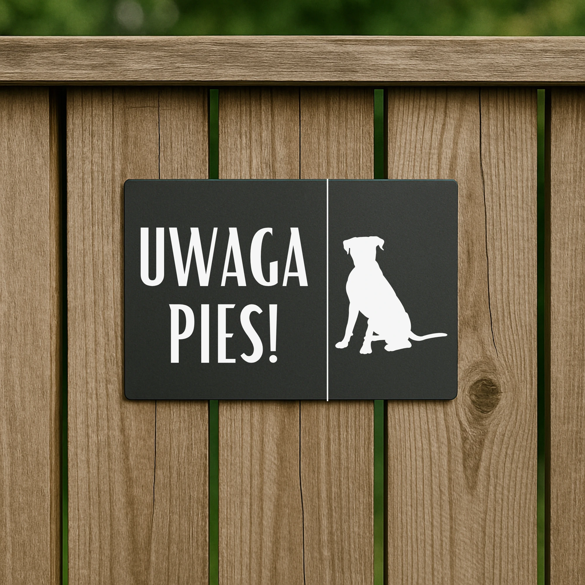 Wzór 1 przedstawia psa w ogrodzie w nowoczesnej, minimalistycznej formie graficznej, która doskonale wkomponuje się w każdy styl ogrodzenia. Biały nadruk na antracytowym tle jest czytelny i przyciąga uwagę, dzięki czemu skutecznie ostrzega o obecności psa. Tabliczka „Uwaga Pies!” pasuje zarówno do klasycznych ogrodzeń, jak i do nowoczesnych rozwiązań architektonicznych.
