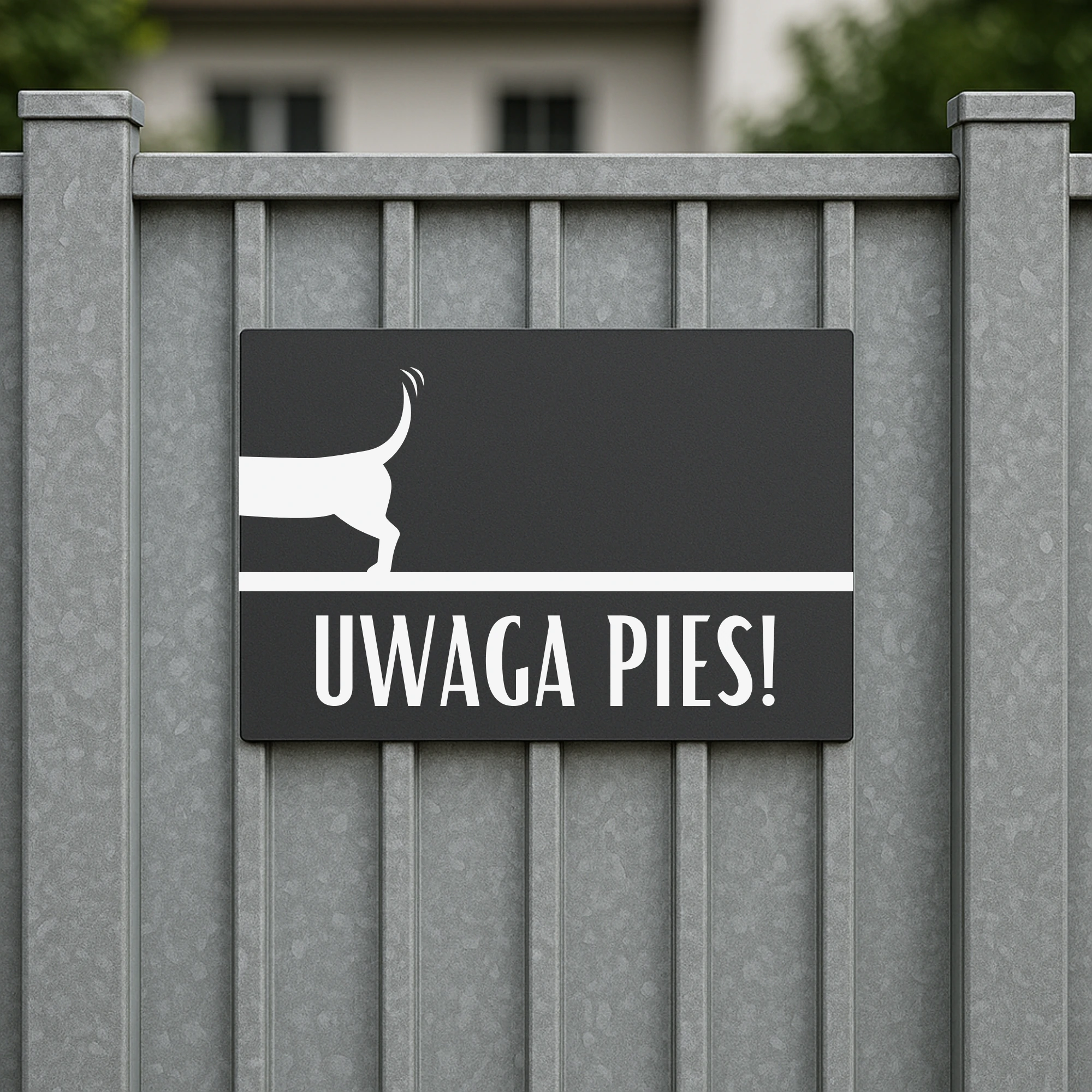 Dynamiczna grafika psa w ruchu oraz wyraźny napis „Uwaga Pies!” przyciągają wzrok i skutecznie ostrzegają przed obecnością czworonoga. Dzięki temu tabliczka sprawdza się nie tylko jako element dekoracyjny, ale przede wszystkim jako skuteczne zabezpieczenie Twojej posesji. Wzór 2 wyróżnia się spośród klasycznych tabliczek swoim unikalnym designem i profesjonalnym wykonaniem.
