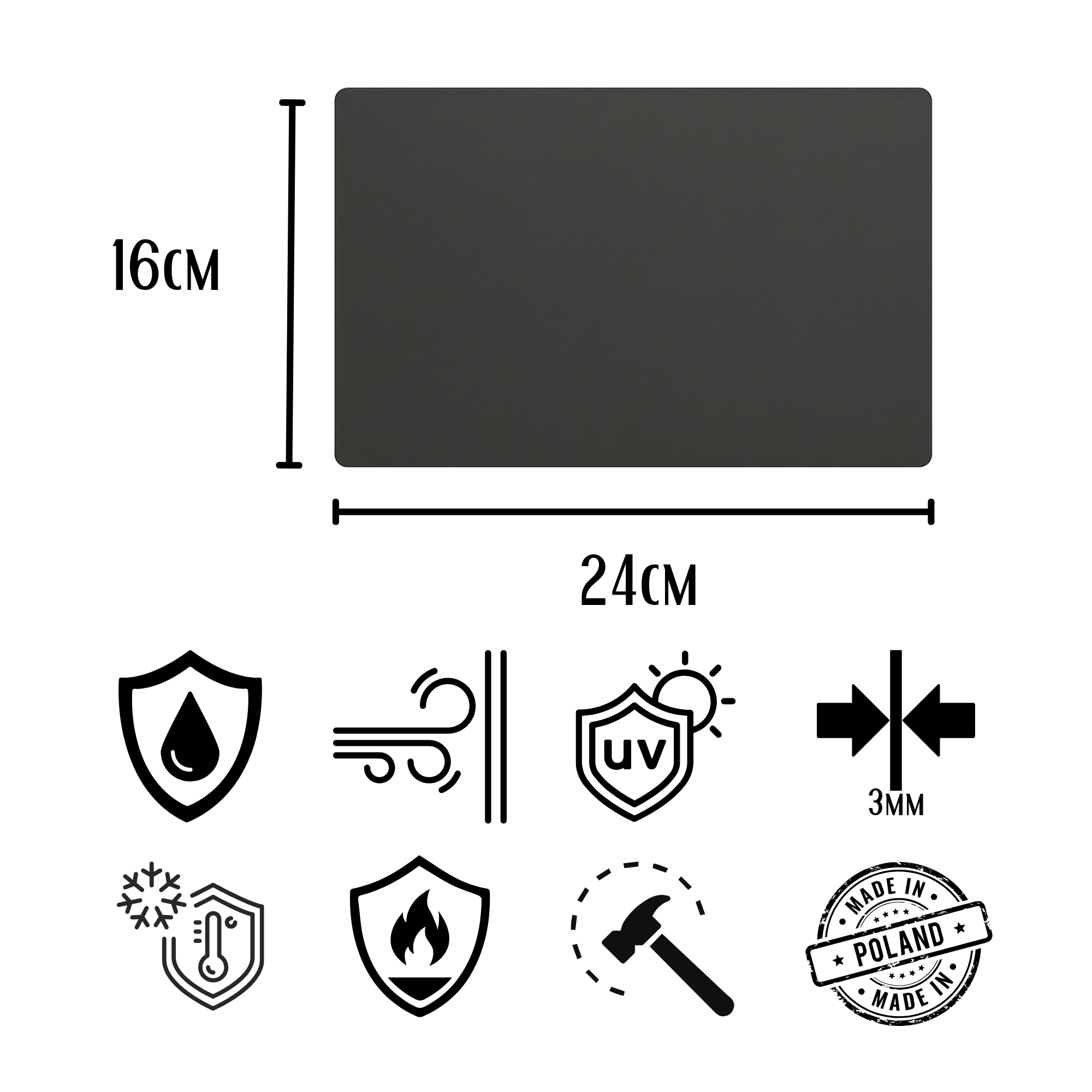 Tabliczka ma wymiary 24 cm długości i 16 cm szerokości, dzięki czemu jest dobrze widoczna i czytelna nawet z większej odległości. Grubość 3 mm dibondu sprawia, że tabliczka jest lekka, ale jednocześnie wyjątkowo solidna i odporna na uszkodzenia mechaniczne. Antracytowy kolor doskonale komponuje się z nowoczesnymi ogrodzeniami oraz klasycznymi aranżacjami, nadając całości elegancki charakter.
