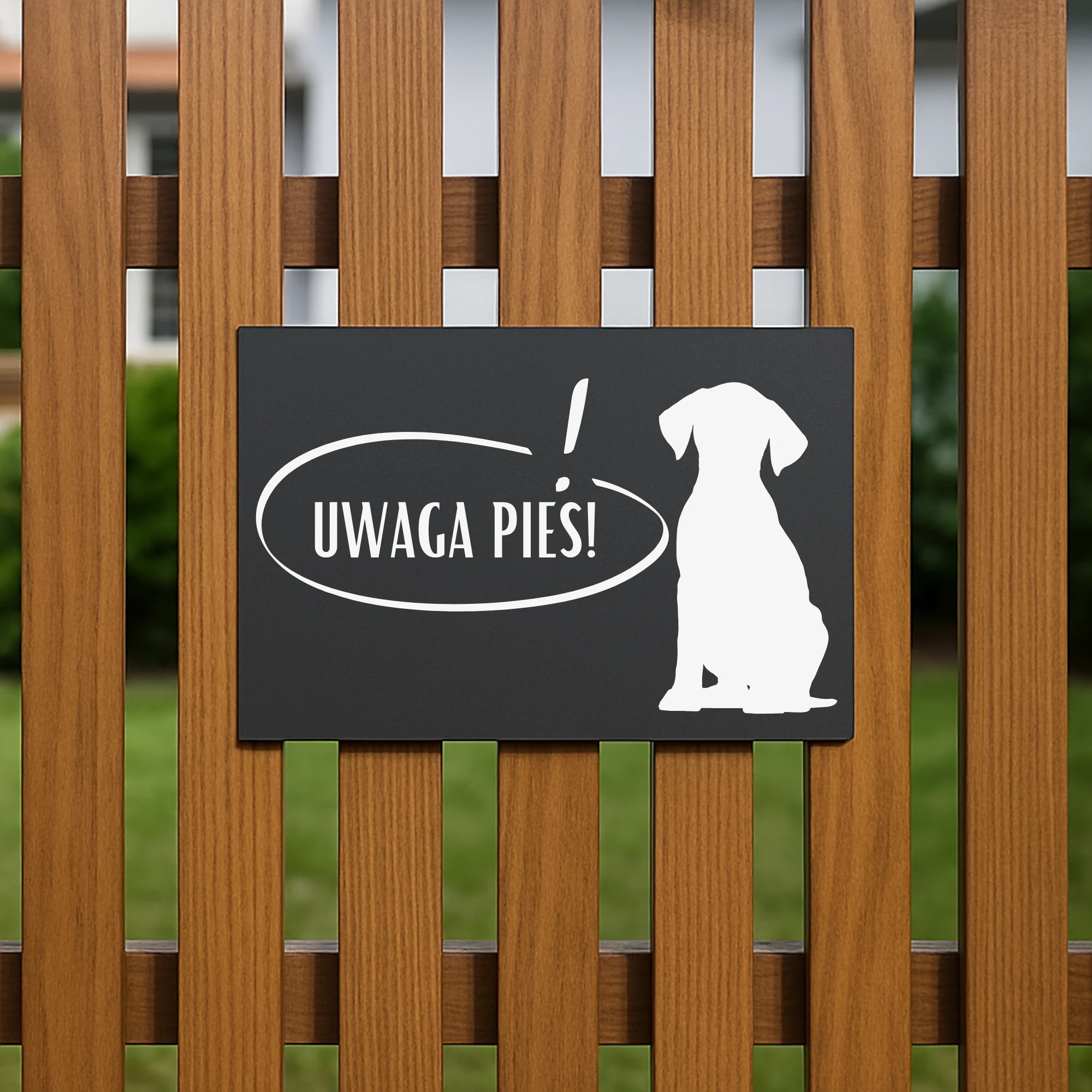 Grafika psa w pozycji siedzącej oraz wyraźny napis „Uwaga Pies!” przyciągają wzrok i pełnią funkcję ostrzegawczą. Dzięki temu tabliczka nie tylko spełnia swoje zadanie, ale także stanowi atrakcyjny element dekoracyjny posesji. Wzór 4 wyróżnia się eleganckim designem i starannym wykonaniem, które doceni każdy właściciel czworonoga.