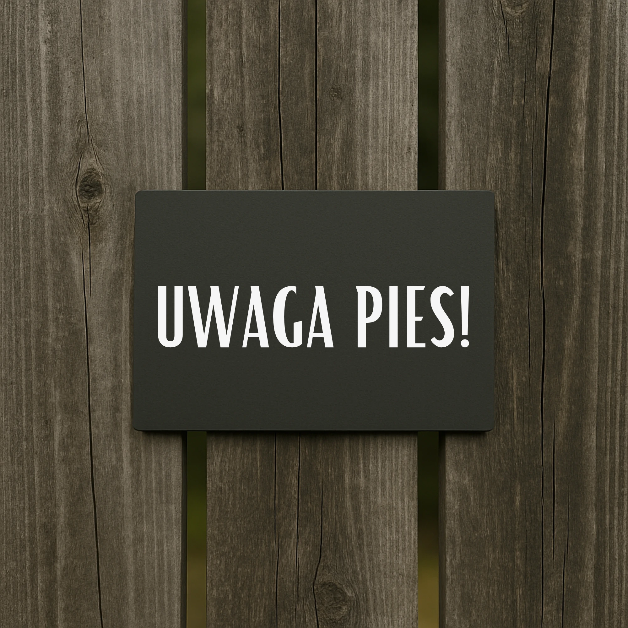 Minimalistyczna forma tabliczki skupia uwagę na czytelnym napisie „Uwaga Pies!”, dzięki czemu pełni ona swoją funkcję ostrzegawczą w sposób wyraźny i skuteczny. Wzór 8 idealnie sprawdzi się zarówno w przestrzeni prywatnej, jak i publicznej, niezależnie od rodzaju ogrodzenia.